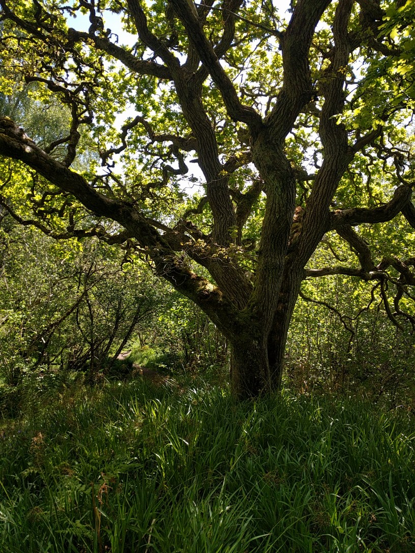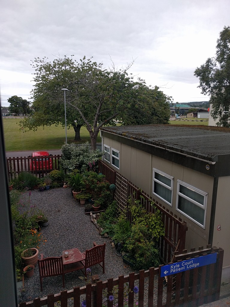 So, three weeks ago, on the Summer Solstice (called grianstad in the Gaelic) I accepted a lift (thank you again, Helen Wright) to Raigmore Hospital, Inverness; lay quite still under backlit photographs of Quercus and Tilia (Oak and Linden trees), while emitting gamma rays from radioactive dye that was coursing about my lymphatic system until peed out blueishly the next day; talked to perimeter trees, a veritable Ogham set of species; and stayed overnight in a guest room ‘Jura’ overlooking a courtyard garden, like “the shrine without a roof” of my matronhood.