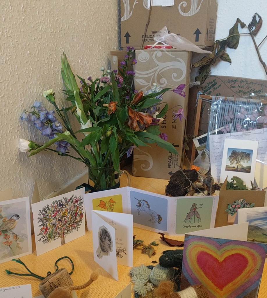 I have been self-caring for the focused enwholing of these, in the online company of my niece Alice Percival Jones and – side by side – with my childhood friend Gilly Morgan who visited recently. Also I’m feeling garlanded around with well-wishing and prayers from a veritable hammocky network of comfort, stretching from the Shetland Isles and Sweden to South Island, New Zealand; from California to Jerusalem and Japan.